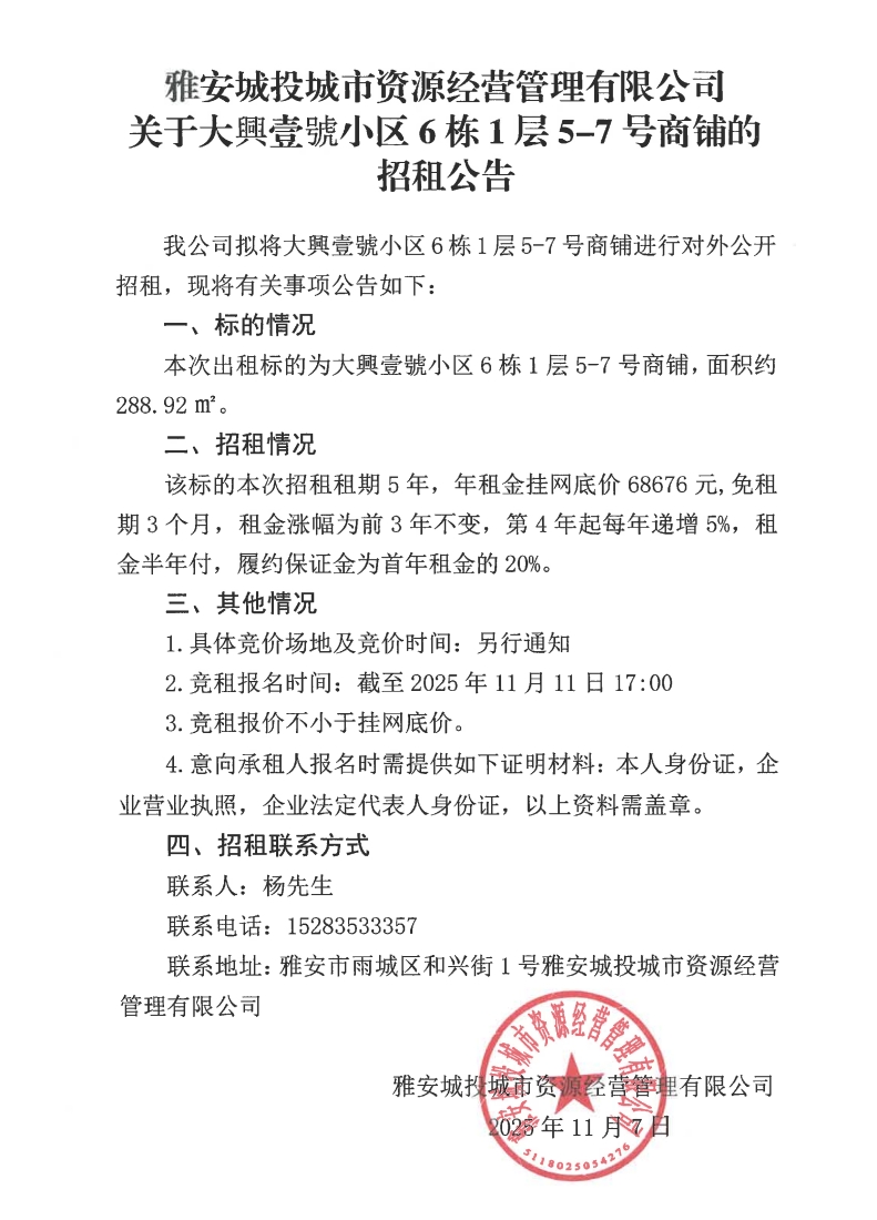 雅安城投城市資源經(jīng)營(yíng)管理有限公司關(guān)于大興壹號(hào)小區(qū)6棟1層5-7號(hào)商鋪的招租公告