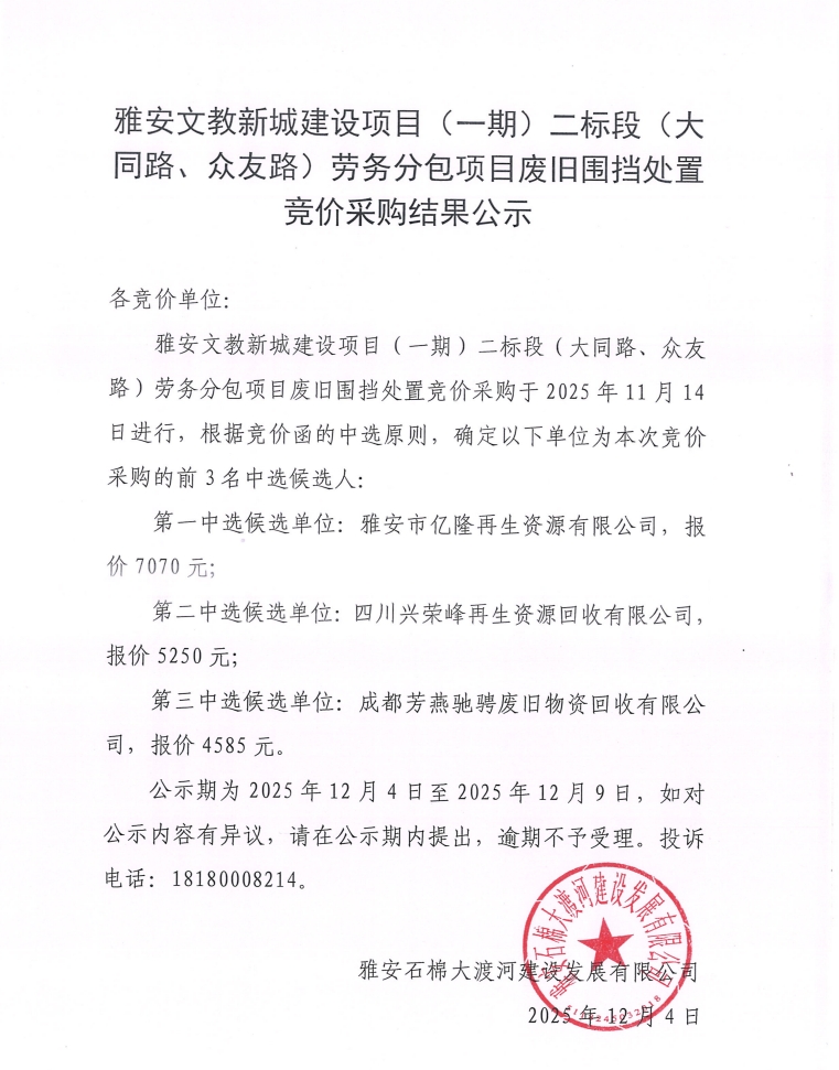 雅安文教新城建設(shè)項(xiàng)目(一期)二標(biāo)段(大同路、眾友路)勞務(wù)分包項(xiàng)目廢舊圍擋處置競價采購結(jié)果公示